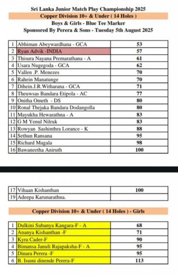 RCGC, Colombo, August 5, 2025 (ePRESS) – Kaya Daluwatte and Adithya Weerasinghe emerged as the top performers in the qualifying round of the Sri Lanka Junior Match Play Championship 2025 for the Rukmini Kodagoda Trophy, sponsored by Perera and Sons Bakers (Pvt) Ltd. Both players carded impressive rounds to top the Gold Division leaderboard at the Royal Colombo Golf Club on Tuesday.