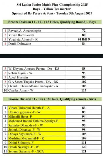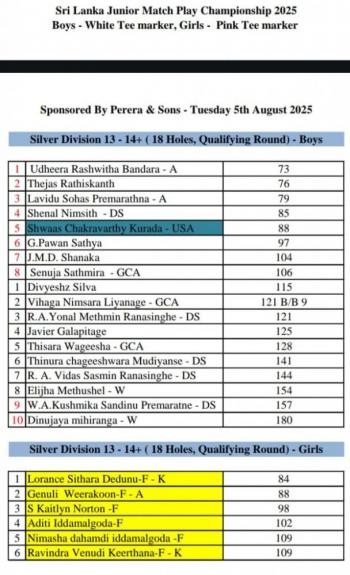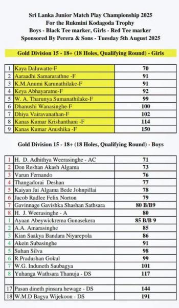 Among the boys, besides Weerasinghe and Reshan Algama (73), Varun Fernando (76) and Thangadorai Deshan (77) also posted competitive scores to qualify for the match play draw. The depth of talent in the boys’ category was evident as several players, including Jacob Norton (79) and Gavinnage Gavishka Shashan Sathsara (80), delivered steady rounds.